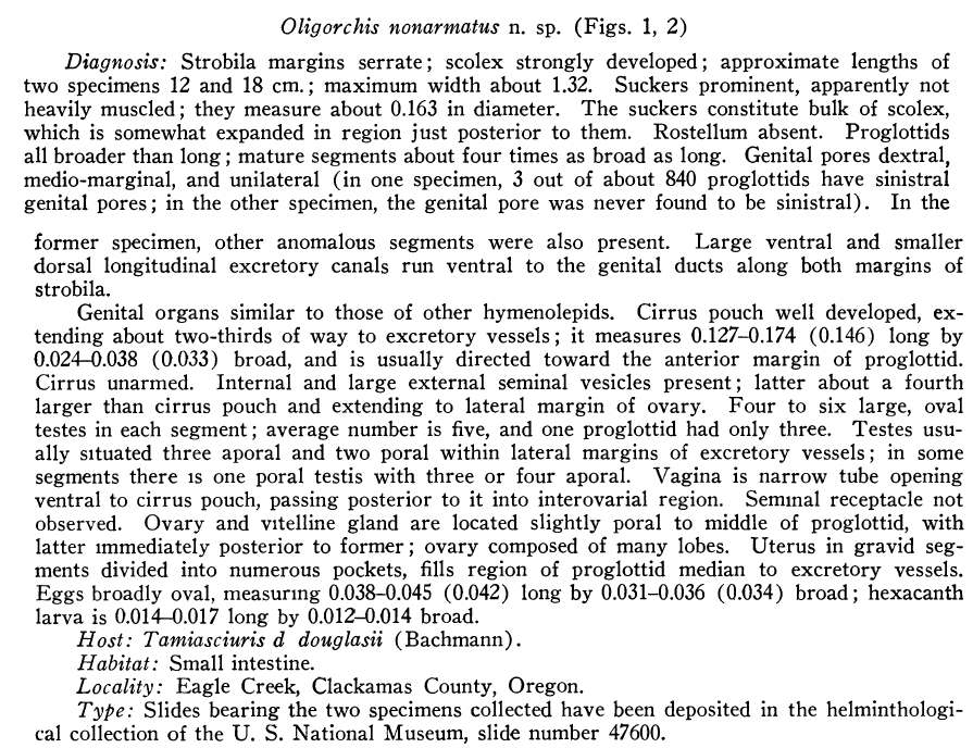 Neiland, K. A. 1952. Helminths of Northwestern mammals. Part II. Oligorchis nonarmatus n. sp. (Cestoda: Hymenolepididae) from the yellow-bellied squirrel. Journal of Parasitology 38: 341-345.