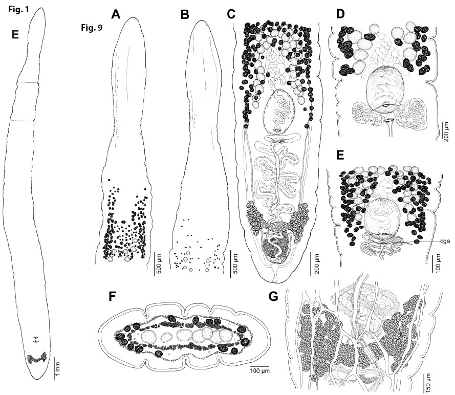 Figure 1. Outlines of adults of caryophyllidean tapeworms (Cestoda) parasitizing Clarias batrachus in the Indomalayan Region. (E) Lytocestus indicus (Moghe, 1925). Figure 9. Lytocestus indicus (moghe. 1925). (A, B) ANterior part of the body with the first vitelline follicles and testes. (C) Posterior part of the body, ventral view. (D, E) Region of gonopores, ventral view; note variation in the posterior extent of vitelline follicles in relation to the cirrus-sac. 9F0 Cross-section at the level of the testicular region. (G) Ovary, ventral view; note the shape of the ovary and the absence of a seminal receptacle. Abbreviation: cga = common genital atrium.