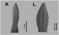 Figure 2. Scanning electron micrographs of the scolices of caryophyllidean tapeworms (Cestoda) from Clarias batrachus in the Indomalayan Region. (K, L) Lytocestus indicus (Moghe, 1925).