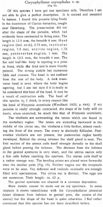 Bovien, P. 1926. Caryophyllaeidae from Java. Videnskabelige Meddelelser fra Dansk naturhistorisk Forening i Kobenhavn 82: 157-181. (654) Download PDFAsh A., T. Scholz, M. Oros, and P. K. Kar. 2011. Tapeworms (Cestoda: Caryophyllidea), parasites of Clarias batrachus (Pisces: Siluriformes) in the Indomalayan Region. Journal of Parasitology 97(3): 435-459. (5944) Download PDF |