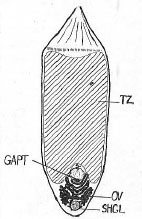 Fig. 15. Caryophyllaeus oxycephalus. Diagrammatic drawing. TZ, testicular zone. The follicles are not indicated. Ca. 4.5/1.