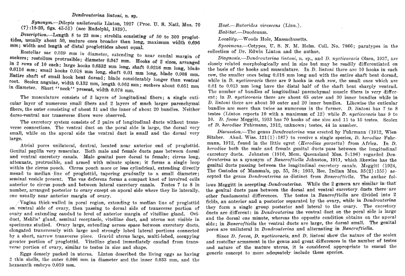 Olsen, O. W. 1937. A new species of cestode, Dendrouterina lintoni (Dilepidiidae), from the little green heron (Butorides virescens (Linn.)). Proceedings of the Helminthological Society of Washington 4: 72-75.