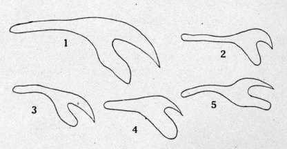 Fig. 3. Tableau des crochets ramenés à la même échelles des espèces armées du genre Hymenolepis parasites des Chiroptères. 1 .H. acuta (Rud.); 2. H. sandgroundi Baer; 3. H. kerivoulae n. sp.; 4. H. balsaci Joyeux et Baer; 5. H. decepiens (Dies.).