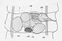 Fig. 4. Hymenolepis kerivoulae n. sp. Segment sexué. ov = ovaire, pc = poche du cirre, rs = réceptacle séminal, t = testicules, vd = vas deferens, ve = vaisseaux excréteurs, vit = glande vitellogène.