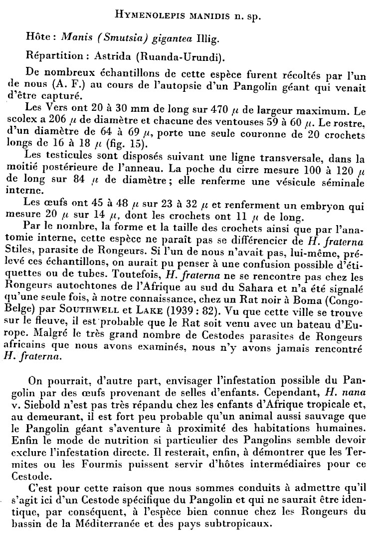 Baer, J. G. and A. Fain. 1955. Les cestodes des pangolins. Bulletin de le Société Neuchâteloise des Sciences Naturelles 78: 37-52. (2800) Download PDF |