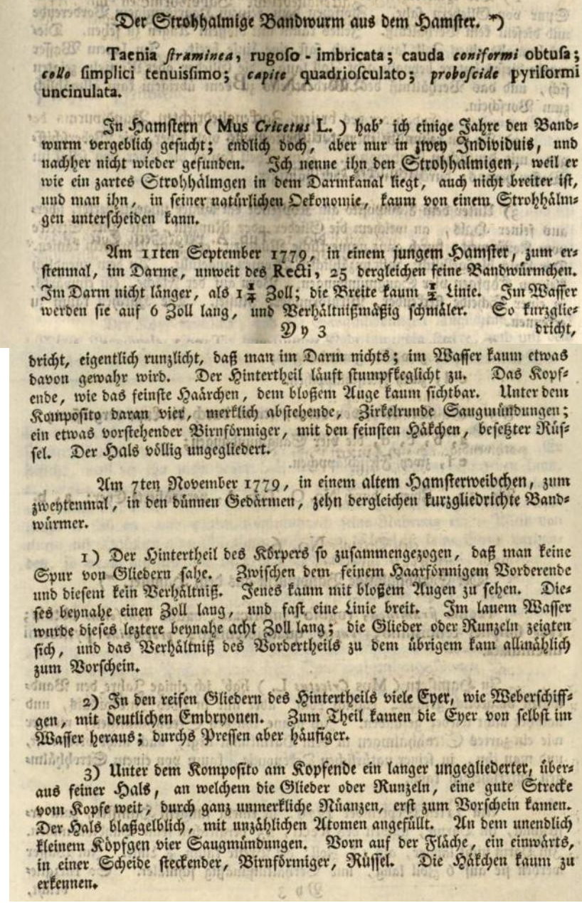 Goeze, J. A. E. 1782. Versuch einer Naturgeschichte der Eingeweidewürmer thierischer Körper. Gedruckt bey Philipp Adam Pape, Blankenburg, 471 pp & 44 plat pp. (4166) Download PDFSpasskii, A. A. 1954. Klassifikaciya gimenolepidid mlekopitayuschih [Classification of hymenolepidids of mammals]. Trudy Gel’mintologcheskoi Laboratorii 7: 120–167. (6497) Download PDF |