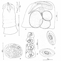 Fig. 1. Retinometra fulicatrae sp. n., a -- scolex with invaginated rostellum; b -- rostellar hook; c -- male proglottis; d -- four proglotttides with internal organs; e -- mature uterine proglottis; f -- eggs