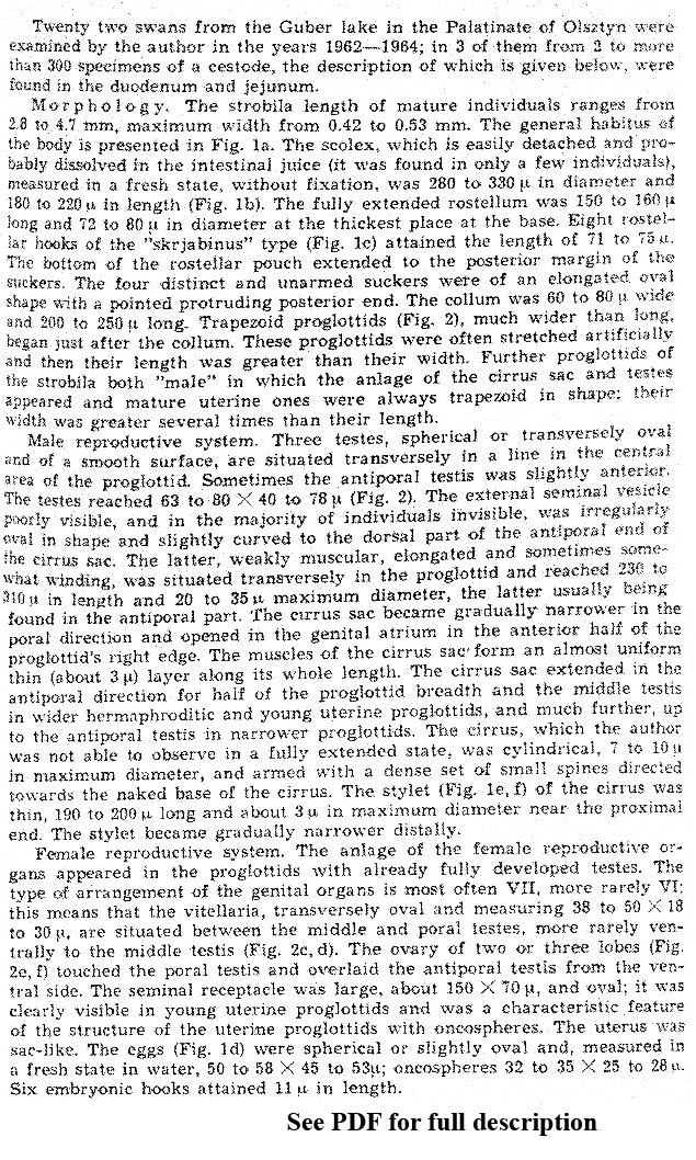 Czaplinski, B. 1965. Retinometra guberiana sp. n. (Cestoda, Hymenolepididae), a new cestode species from Cygnus olor (Gm.). Acta Parasitologica Polonica 13(5): 35-39. (6326) Download PDF |