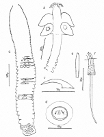 Fig. 1. Retinometra guberiana sp. n. a -- entire worm; b -- scolex and neck; c -- rostellar hook; d -- egg; e -- proximal end of the cirrus stylet; f -- distal end of cirrus and stylet