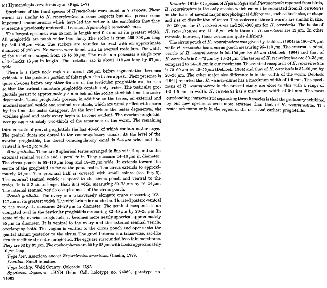 Ahern, W. B. and G. D. Schmidt. 1976. Parasitic helminths of the American avocet Recurvirostra americana: four new species of the families Hymenolepididae and Acoleidae (Cestoda: Cyclophyllidae). Parasitology 73(3): 381-398. (5663) Download PDF |