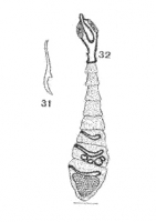 Figs. 31, 32. H. pauciannulata. 31. Rostellar hook. 32. Strobilas.