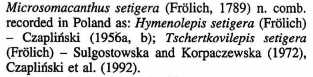 | Synonyms | Hymenolepis setigera 9Frolich) - Czaplinski (1956a, b); Tschertkovilepis setigera (Frolich) - Sulgostowska and Koraczewska (1972), Czaplinski et al. (1992). |