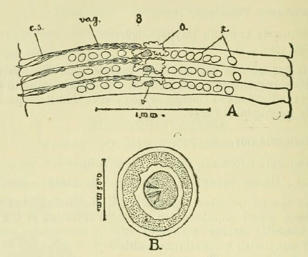 Fig. 8. Chitinolepis mjöbergi. A, semi-diagrammatic representation of three mature segments in ventral view, from a whole preparation; c-s, cirrus-sac; o, ovary; t, testes; v, yolk-gland; vag, vagina; B, an egg.