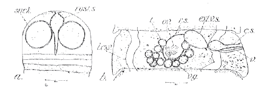 Text-Fig. 13. - Pseudoligorchis magnireceptaculata, gen. et sp. nov. a. Scolex; b. Mature proglottis.