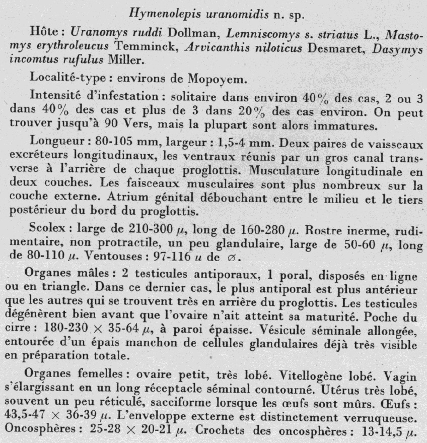 | Host Notes | Five hosts given: Uranomys ruddi (Deomyinae), Lemniscomys striatus (Murinae), Mastomys erythroleucus (Murinae), Arvicanthis niloticus (Murinae) and Dasymys incomtus (Murinae). Type host not specified. Hunkeler (1973) designates Uranomys ruddi as type species. |