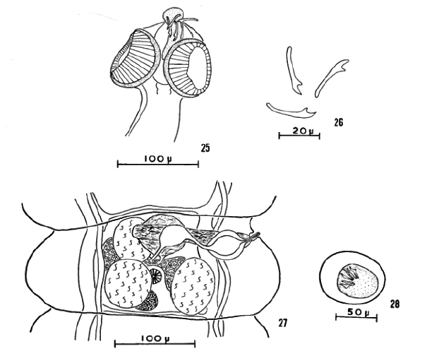 Figs. 25 and 26. Hymenolepis mahonae nom. nov. Scolex (Fig. 25), and rostellar hooks (Fig. 26).