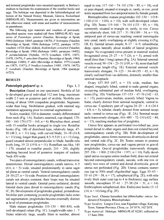 Makarikova, T.A. and A.A. Makarikov. 2012. First report of Potorolepis Spassky, 1994 (Eucestoda: Hymenolepididae) from China, with description of a new species in bats (Chiroptera: Rhinolophidae). Folia Parasitologica 59 (4) : 272–278. (6006) Download PDF |