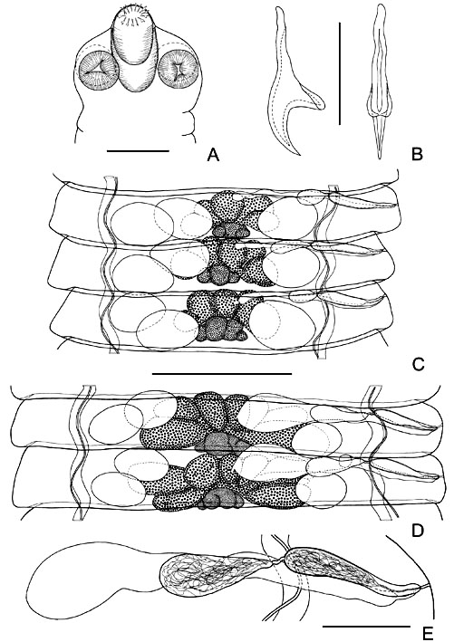 Fig. 1. Potorolepis gulyaevi sp. n. from Rhinolophus sinicus, China; holotype (MHNG-PLAT 82283). A – dorsoventral view of scolex; B – rostellar hooks in profile and view from posterior surface showing enlarged hook guard; C – male mature proglottides, from dorsal side; D – hermaphroditic mature proglottides, from dorsal side; E – genital ducts, from dorsal side. Scale bars: A = 250 μm; B = 30 μm; C, D = 300 μm; E = 100 μm