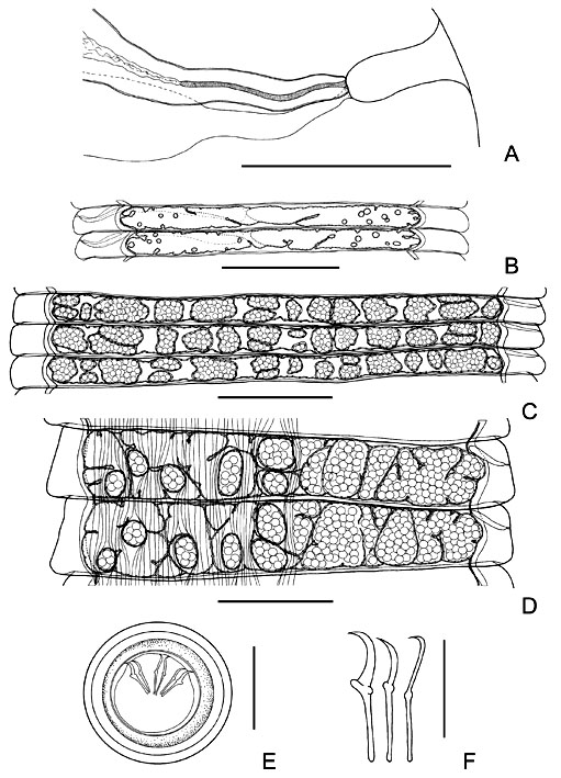 Fig. 2. Potorolepis gulyaevi sp. n. from Rhinolophus sinicus, China; holotype (MHNG-PLAT 82283). A – cirrus and vagina; B – postmature proglottides from dorsal side, showing uterus development; C – pregravid proglottides from dorsal side, showing appearance of uterine diverticula; D – gravid proglottides from dorsal side, showing saccate uterus with dorsal uterine diverticula (muscle fibres of the inner longitudinal musculature are illustrated only on the left side of the proglottis); E – egg; F – embryonic hooks. Scale bars: A = 30 μm; B–D = 500 μm; E = 30 μm; F = 10 μm