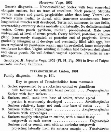 | Type Species | Mesogyna hepatica Voge, 1952 |
