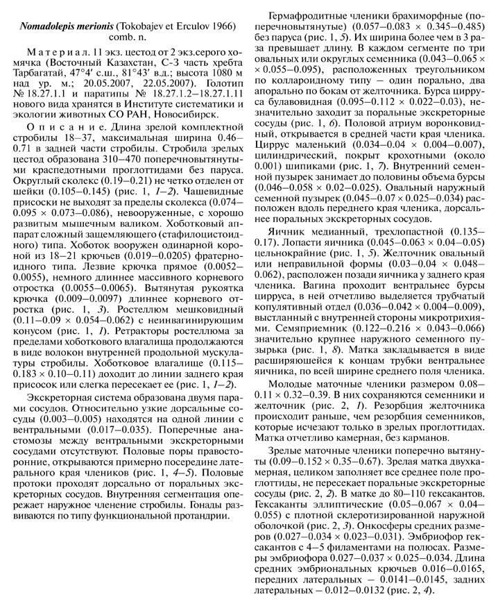 Makarikov, A.A., V.D. Gulyaev and A.V. Krivopalov . 2010. Nomadolepis (Cyclophyllidea: Hymenolepididae) - a new cestode genus from rodents [in Russian]. Zoolgicheskii Zhurnal 89 (8): 948–955.