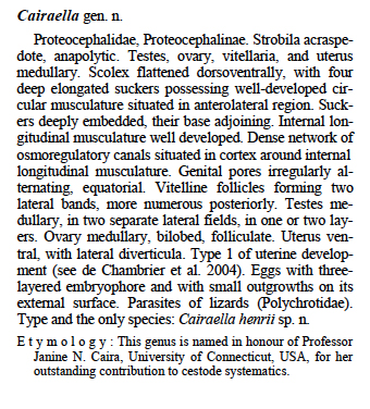 Coquille, S. C. and A. de Chambrier. 2008. Cairaella henrii gen. n., sp. n., a parasite of Norops trachyderma (Polychrotidae), and Ophiotaenia nicoleae sp. n. (Eucestoda: Proteocephalidea), a parasite of Thecadactylus rapicauda (Gekkonidae), in Ecuador. Folia Parasitologica 55: 197-206. (4688) Download PDF |