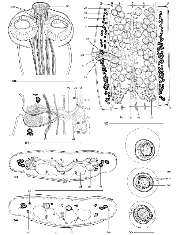 canal; te testes; ud uterine diverticula; us uterine stem; ut uterus; va vas deferens; vc vaginal canal; vi vitelline follicles; vo - ventral osmoregulatory canal; vs - vaginal sphincter. Scale bars: Figs. 50, 51 = 250 ΅m; Figs 52-54 = 500 ΅m; Fig. 55 = 20 ΅m. |