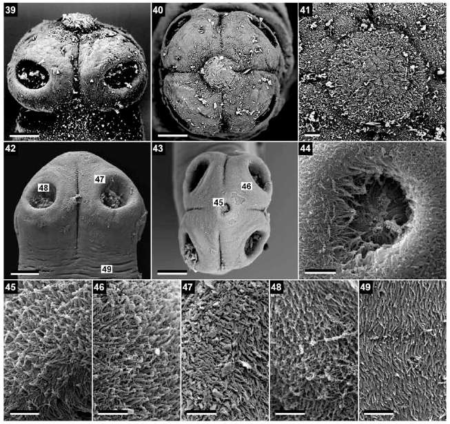 Fig. 42. Scolex, lateral view. Note: small numbers correspond to the figures showing higher magnification images of these surfaces. Fig. 43. Scolex, apical view; apical organ invaginated. Fig. 44. Detail of the apical organ showing long capilliform filitriches, apical view. Fig. 45. Fig. 46. P2@1&&13*".(/&1+"1)%#$(