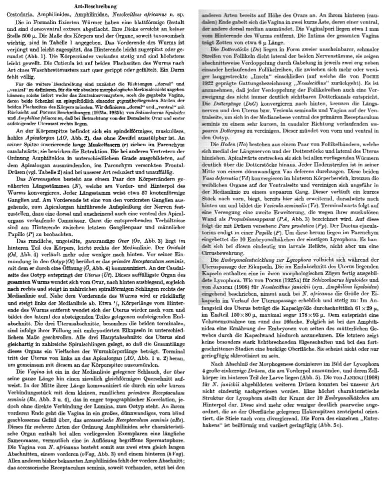 Donges, J. and W. Harder. 1966. Nesolecithus africanus n. sp. (Cestodaria, Amphilinidea) aus dem Coelom von Gymnarchus niloticus Cuvier 1829 (Teleostei). . Zeitschrift fur Parasitenkunde 28: 125-141. (15) Download PDF |