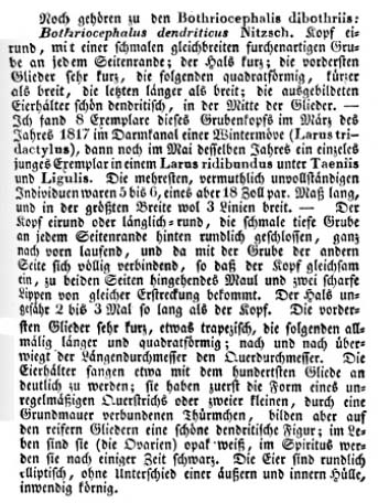 Nitzsch, C. L. 1824. Bothriocephalus. In Allgemeine Encyclopaedie der Wissenschaften und Künste, J. S. Ersch and J. G. Gruber (eds). Gleditsch, Leipzig, 94-98 pp. (6029) Download PDF |