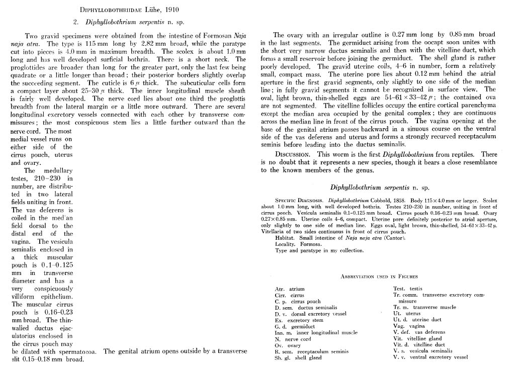 | Synonyms | Spirometra serpentis (Yamaguti, 1935) Wardle, McLeod & Stewart, 1947 |