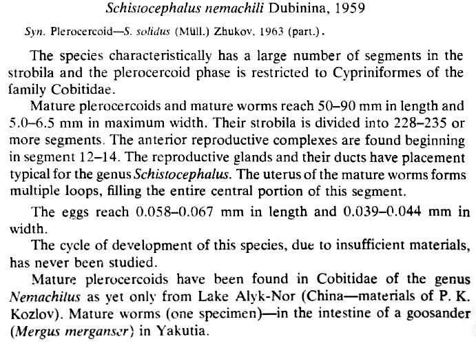 | Additional Host(s) | other fish-eating birds as S. solidus, plerocercoids in Nemachilus crassus (= Triplophysa retropinnis a subspecies of Triplophysa stoliczkai after Kottelat 2012) | ||||||