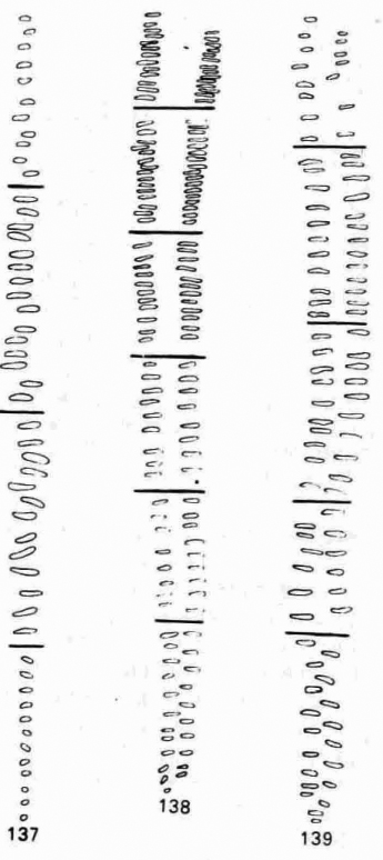 Figs. 137-139. Diagram of placement of reproductive complexes in individual sections of the strobila in LigUla colym bi (137) and Digramma nemachili (138 and 139).