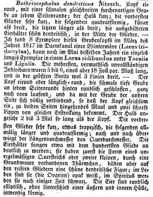 Nitzsch, C. L. 1824. Bothriocephalus. In Allgemeine Encyclopaedie der Wissenschaften und Künste, J. S. Ersch and J. G. Gruber (eds). Gleditsch, Leipzig, 94-98 pp. (6029) Download PDFLühe, M. 1910. Die Süsswasserfauna Deutschlands. Heft 18. A. Brauer (ed). Hafner Publishing Co., New York, N.Y., 1-148 pp. (5389) Download PDF |