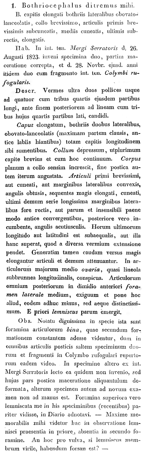 Creplin, F. C. H. 1825. Observationes de Entozois. Gryphiswaldiae : Sumtibus Mauritii Librarii, , 86 pp. (6561) Download PDFLühe, M. 1910. Die Süsswasserfauna Deutschlands. Heft 18. A. Brauer (ed). Hafner Publishing Co., New York, N.Y., 1-148 pp. (5389) Download PDF |
