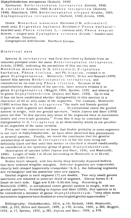 | Valid Name | Diphyllobothrium tetrapterum (von Siebold, 1848) Baer, 1932 |