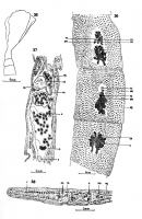 Fig. 35. Scolex. Fig. 36. Whole preparation of segment showing arrangement of genital organs. Fig. 37. Sagittal section of segment. Fig. 28. Transverse section of segment, showing cirrus-sac and uterine pore.