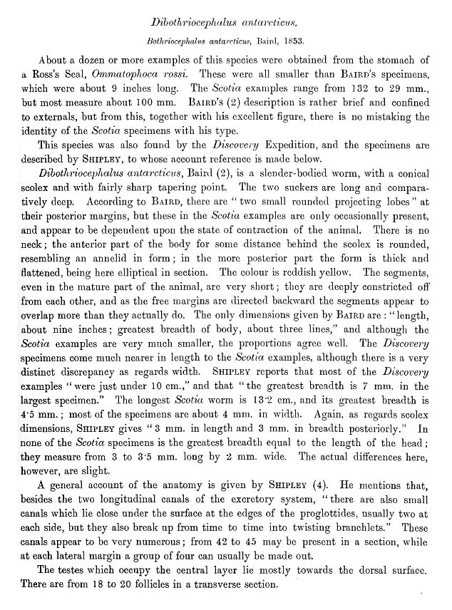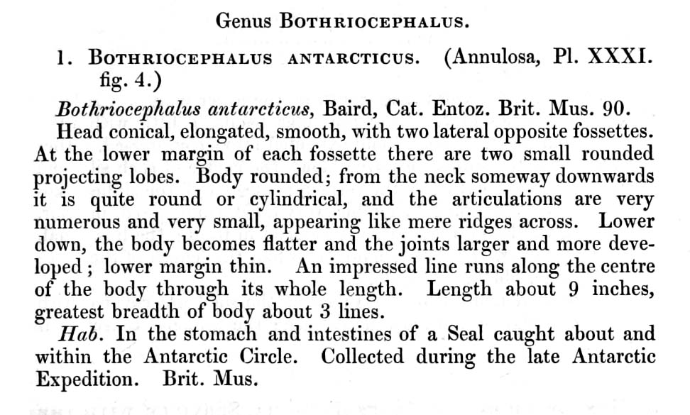 | Synonyms | Bothriocephalus antarcticus Blaird, 1853; Diphyllobothrium antarcticum (Blaird, 1853) Railliet & Henry, 1912 |