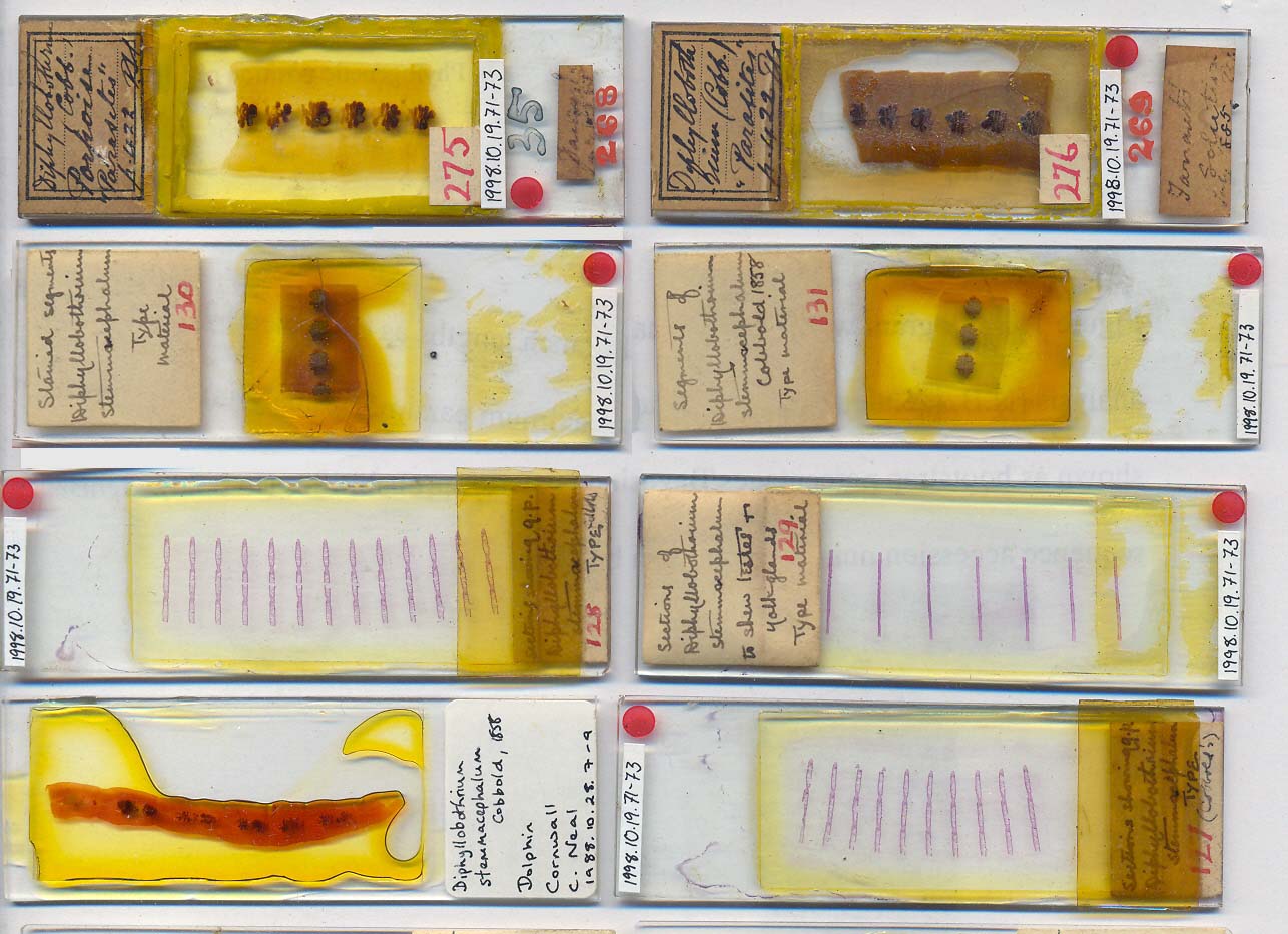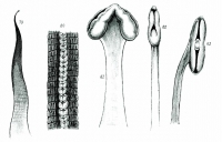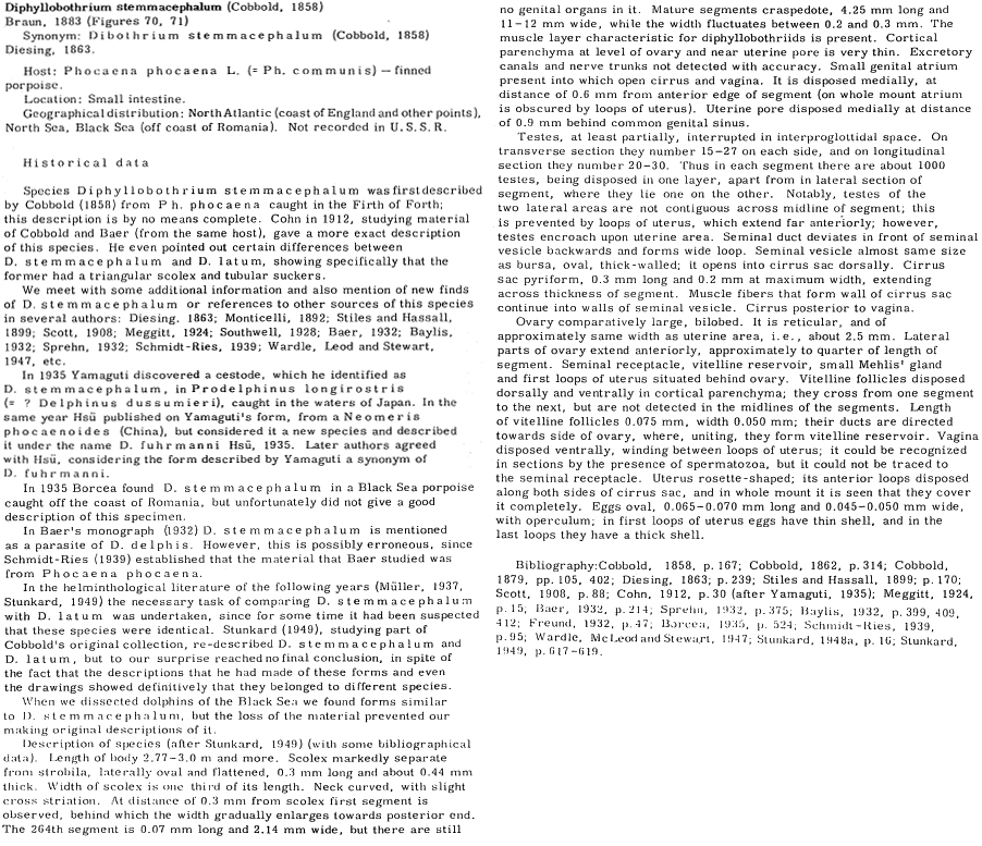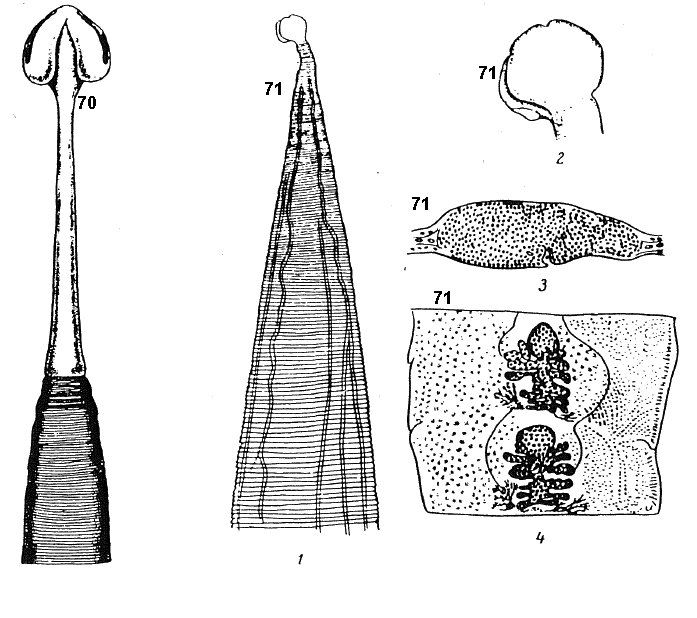 70. Diphyllobothrium stemmacephalum (Cobbold, 1858) Braun, 1883. Scolex neck and first segments (after Scoot, 1909). 71 Diphyllobothrium stemmacephalum (Cobbold, 1858), Braun, 1883: 1 - anterior part of strobila; 2 - scolex; 3 - part of transverse section of segment in region of uterine pore; 4 - mature segment (after Stunkard, 1934).