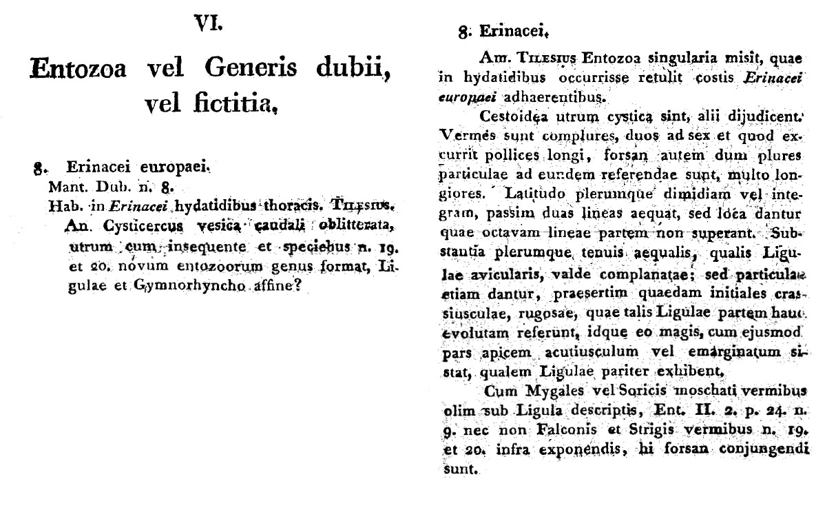 Rudolphi, C. A. 1819. Entozoorum synopsis, cui accedunt mantissa duplex et indices locupletissimi. Sumtibus Augusti Rücker, Berolini (Berlin), 811 pp. (14) Download PDFFaust, E. C., H. E. Campbell, and C. R. Kellogg. 1929. Morphological and biological studies on the species of Diphyllobothrium in China. The American Journal of Hygiene 9(3): 560-583. (6028) Download PDF |