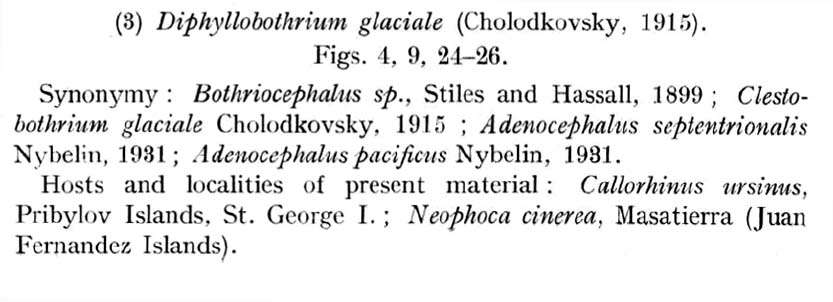 | Scientific Name Notes | Rausch et al. (2010) concuded that the cestode described by Cholodkovsky was indeed a species of Bothriocephalidae, and consider that the fragment of strobila studied by him was probably the remains of a cestode from a fish that had been recently eaten by the seal. |