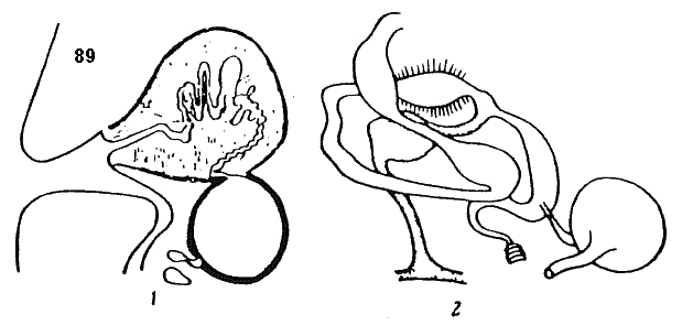 89. Diphyllobothrium latum (L..1758) Lühe, 1910. 1 - cirrus sac and seminal vesicle of sagittal plane of a segment; 2 - details of structure of genital system (after Nybelin, 1922).