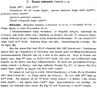 Krabbe, H. 1869. Bidrag til Kundskab om Fuglenes Bændelorme. Det Kongelige Danske Videnskabernes Selskabs Skrifter. 5 Række. Naturvidenskabelig og mathematisk Afdeling. 8 Bind: 249–363. (2595) Download PDFBurt, D. R. R. 1940. New avian cestodes of the family Davaineidae from Ceylon. Ceylon Journal of Science 22: 65-77. (2815) Download PDF |