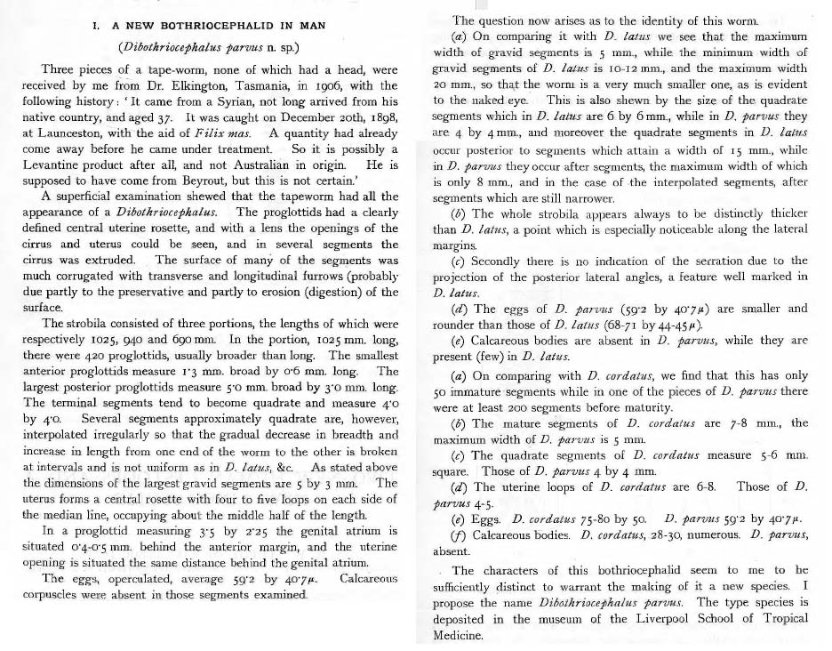 | Locality Notes | -Three pieces of a tapeworm, none of which had a head, were received by me from Dr. Elkington, Tasmania, in 1906, with the following history: It came from a Syrian, not long arrived from his native country, and aged 37. |