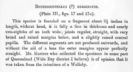 | Host Notes | - under the species name “Bothriocephalus (?) marginatus” , the statement “ Mr masters is of the opinion that it was taken from the intestine of a Wallaby” (Krefft, p. 227) |