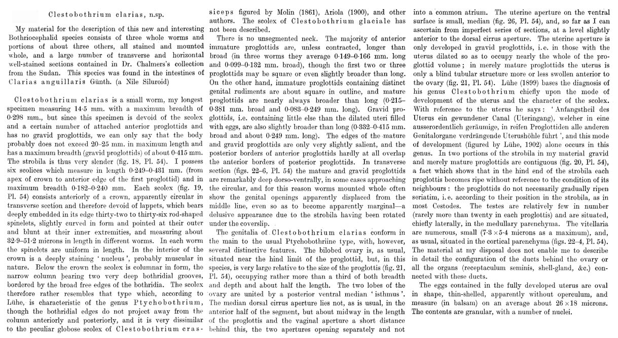 Woodland, W. N. F. 1925. On some remarkable new Monticellia-like and other cestodes from Sudanese siluroids. Quarterly Journal of Microscopical Science 69: 703-729.