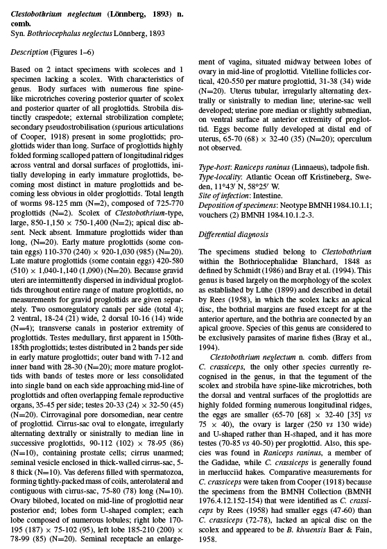 Dronen, N. O. and C. K. Blend. 2003. Clestobothrium neglectum (Lönnberg, 1893) n. comb. (Cestoda: Bothriocephalidae) from the tadpole fish Raniceps raninus (L.) (Gadidae) from Sweden. Systematic Parasitology 56: 189-194. (4550) Download PDF |