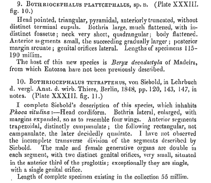 Fig. 1. 10. Bothriocephalus platycephalus, sp. n., head, magnified, p. 323.