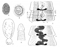 Fig. I . A - Egg of B. phoxini, B - coracidium, C - procercoid, D - scolex of B. phoxini, E - proglottids of juvenile B. phoxini, F - gravid proglottids of B. phoxini; a - ovary, b - vagina, c - opening of vagina, d - uterus, e - ulterine sac, f - uterine pore, g - testicles, h - cirrus pouch, j - excretory canal, k - vitelline follicles.