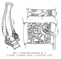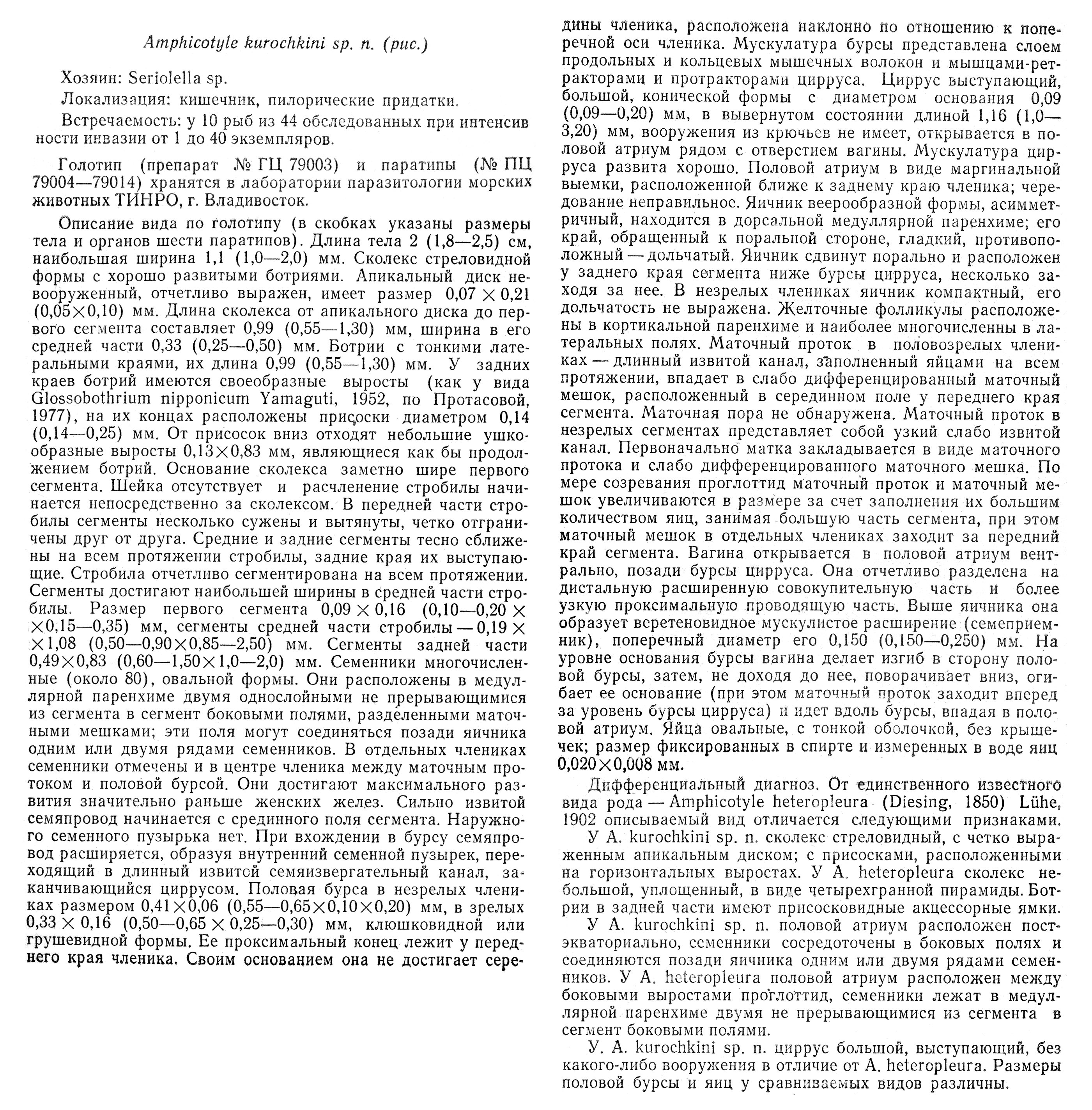 Tkachev, V.A. 1979. A new cestode species Amphicotyle kurochkini n. sp. (Pseudophyllidea: Aphicotylidea), a parasite of the marine fish Seriolella sp. Mater. Nauchn. Konf. Vses. Ova. Gel`mintol. (Tsestodz i tsestodozy) 31: 142-146. (7034) |
